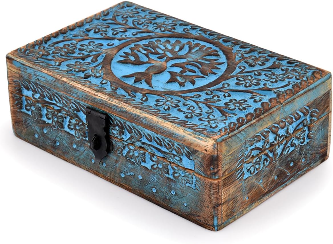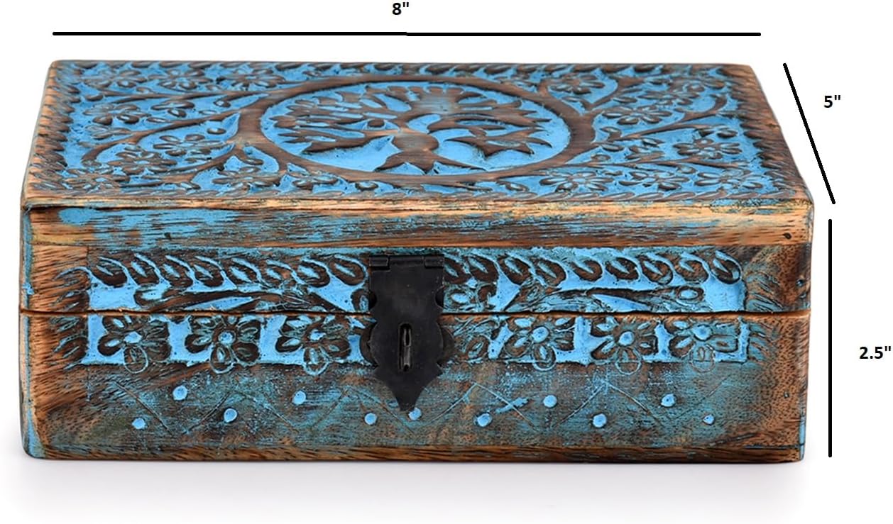 BHAVATU Handmade Mango Wood Blue Tree of Life Engraving Handcarved Jewellery Box for Women-Men Jewel | Home Decor Accents | Decorative Boxes