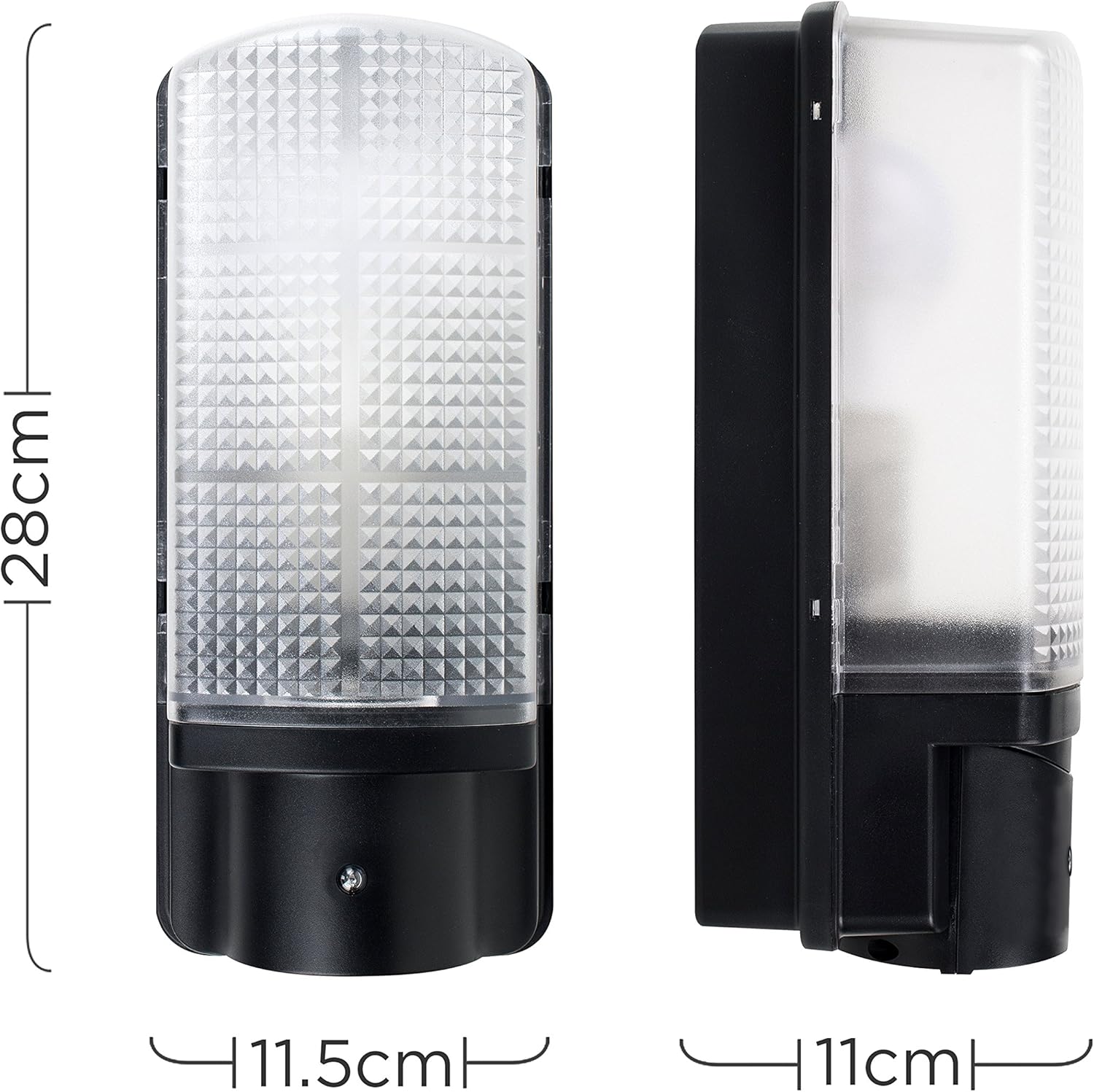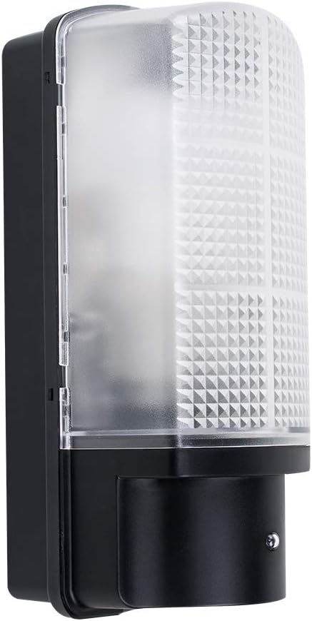 High Quality Heavy Duty Black Bulkhead Wall Light – IP44 Weatherproof Rated – Ideal Security Light For Gardens, Paths, Patios, Garages, Courtyards, Porches and DrivewaysWith Practical Dusk To Dawn Sensor – Light Automatically Switches On When It Goes Dark / Off When It Is Light. Operating Lux: 20Measurements: Height 270mm x Width 120mm x Depth 120mmComes Complete with 1 x MiniSun Branded 10w LED ES E27 GLS Light Bulb [6500K Cool White]Reference Number: 01587