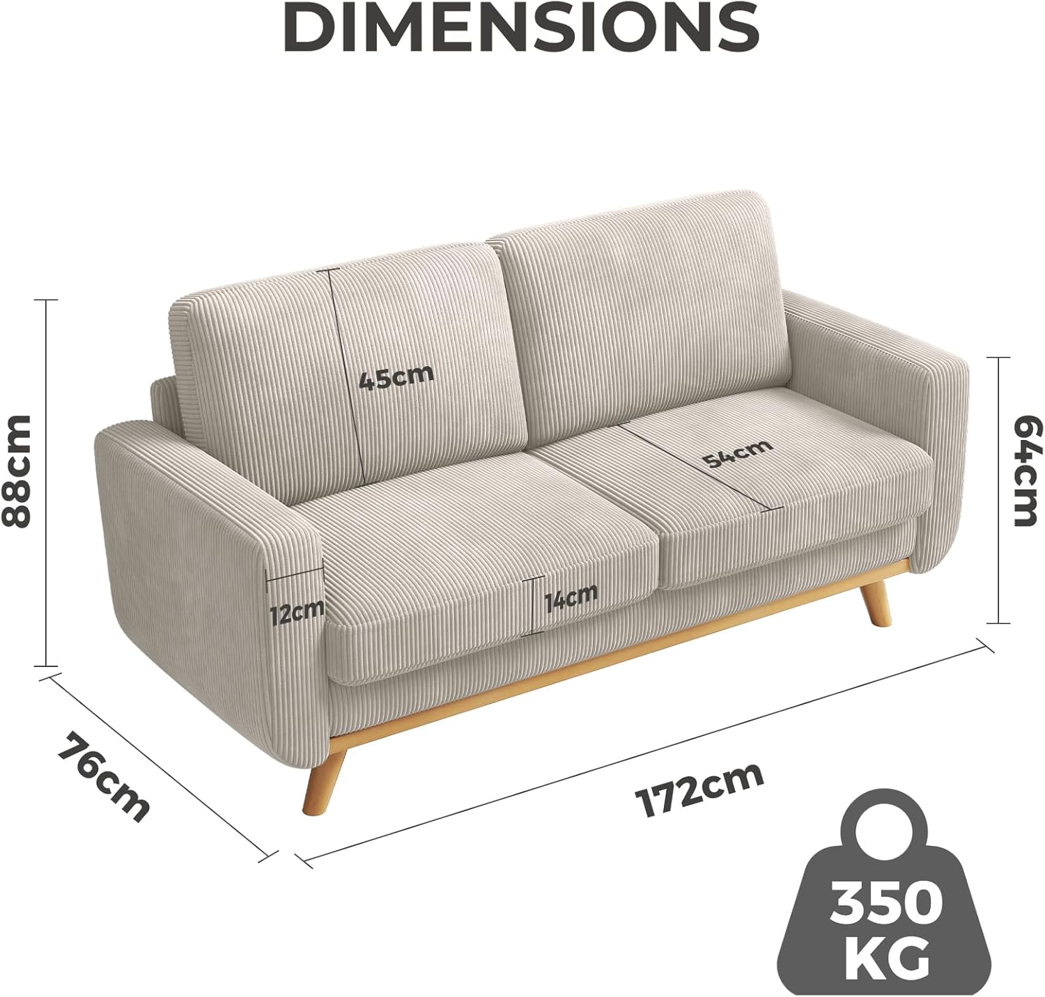 FSC Certified Solid Wood – Made with materials from well-managed forests that support sustainable forestry practices. This loveseat sofa is known for its sturdiness and solidity, with a maximum weight capacity of 350KG. Additionally, the sofa couch features non-slip protective backing on the bottom of the legs, providing stability and preventing damage to flooring