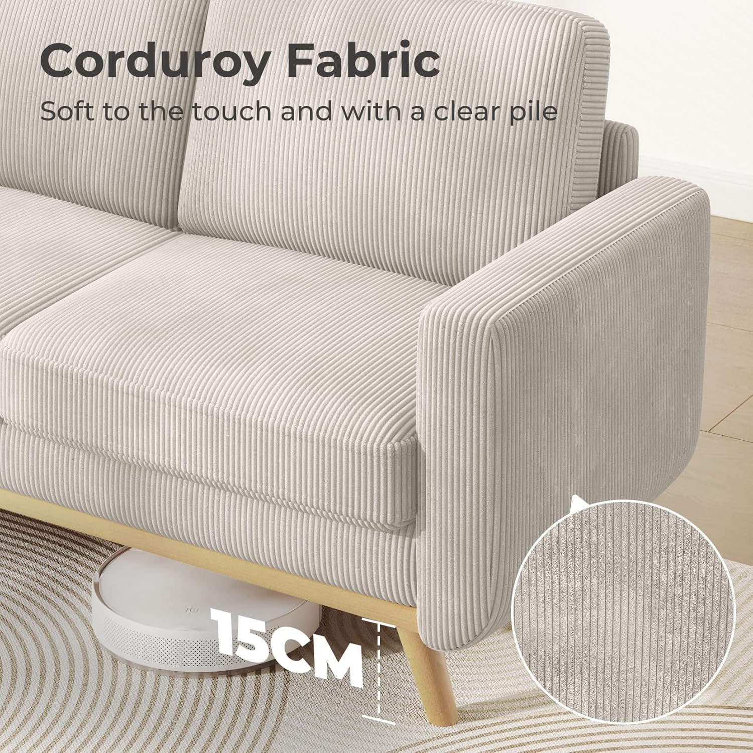 Durable Corduroy Fabric – This corduroy sofa has a unique pattern and texture, characterised by parallel ridges that give it a smooth and soft feel. The loveseat sofa has a clear and rounded velvet-like surface, which adds to its luxurious appearance. Additionally, corduroy couch is thick and wear-resistant, making it an excellent choice for those who demand comfort and durability