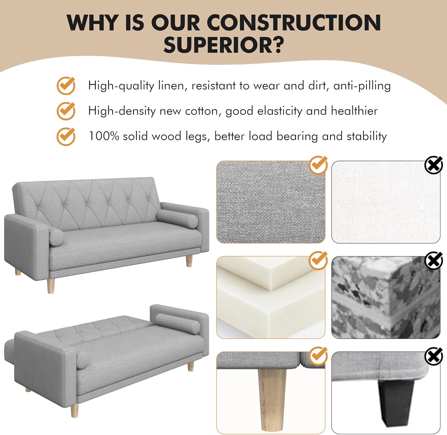 【Convenient Designs For Comfortable Living】Featuring a 20 cm / 8″ ground clearance, this fabric sleeper sofa allows most robot vacuums to clean underneath effortlessly.