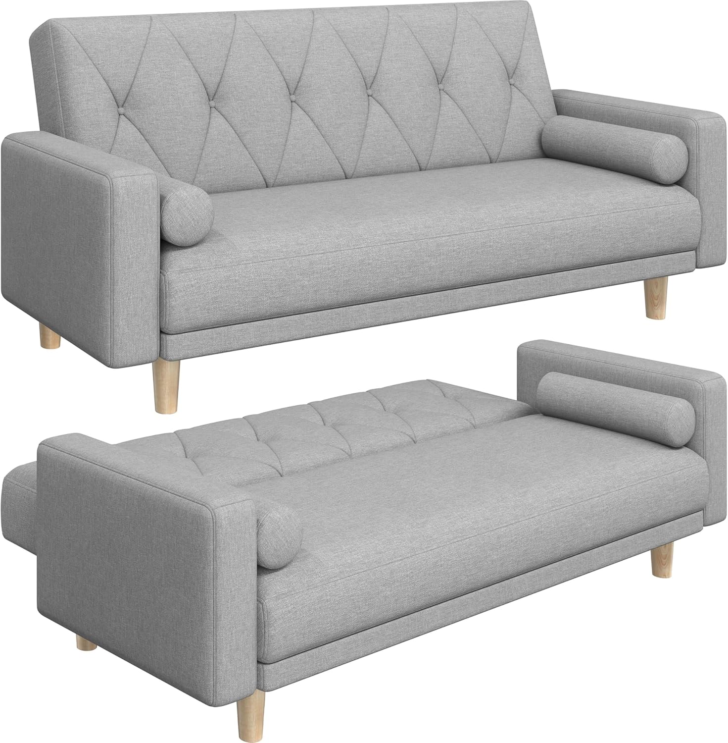 Yaheetech Convertible Sofa Bed Fabric Sofa Couch Click Clack Modern Sleeper Sofa Settee with 2 Bolster Pillows for Living Room/Guest Room Light Grey