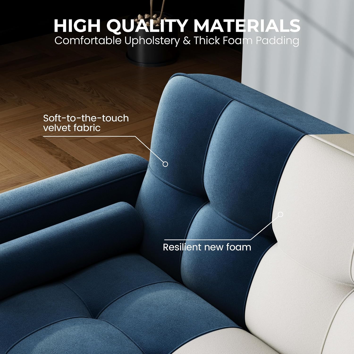 【Comfortable Upholstery & Thick Foam Padding】Wrapped in soft-to-the-touch velvet fabric and supported by sinuous springs and elastic webbing bands, this upholstered sofa bed offers high resilience and durability. Meeting UK flammability regulations, this convertible settee provides years of secure comfort.