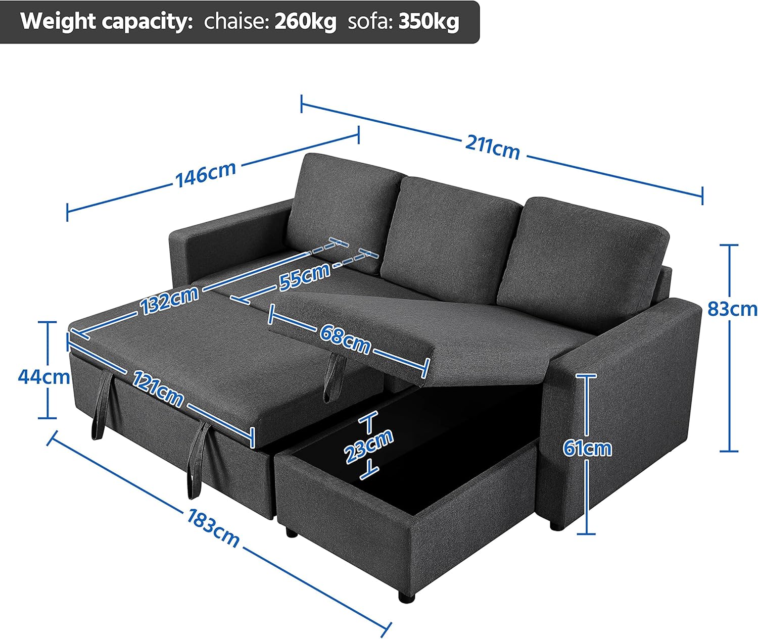 【Specifications】Colour: dark grey; Material: 180g polyester, foam, plywood, metal; Overall dimensions: 211cm L x 146cm W x 83cm H; Sleeping surface (without pillows): 183cm L x 132cm D; Chaise size: 68cm L x 132cm D; Weight capacity: chaise: 255kg; sofa: 350kg