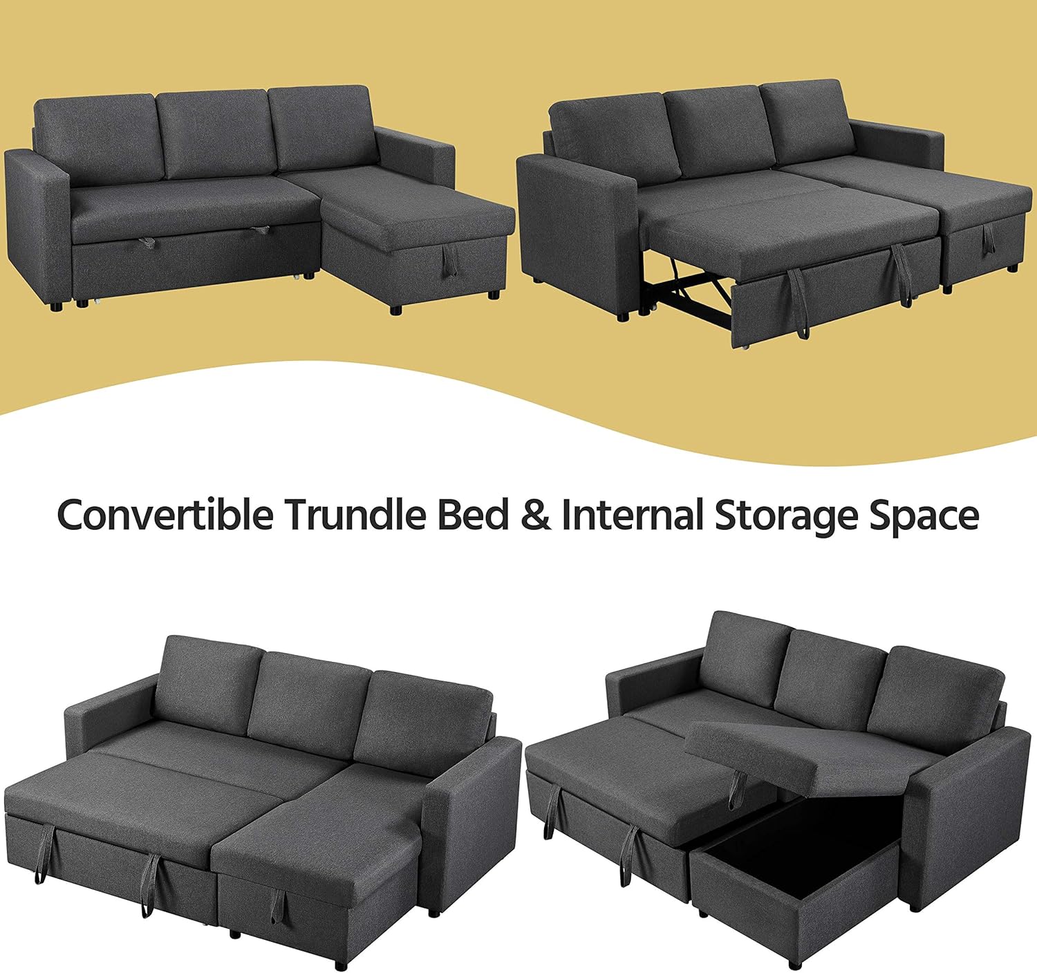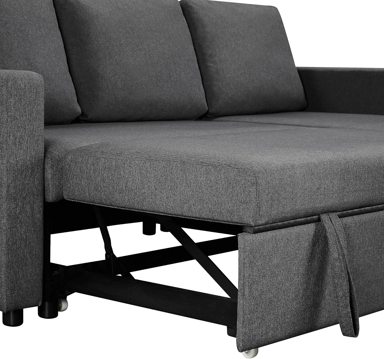 【Convertible Trundle Bed】 The trundle sleeper mechanism hidden under the loveseat helps the bed easily pop up to a comfy double/full bed for two sleepers. The two straps and bottom wheels make for fluent and effortless operation.