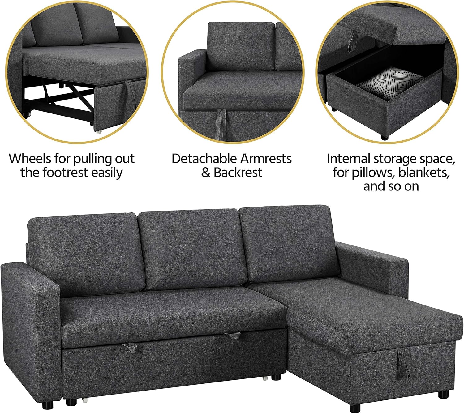 【Limited Space Friendly】 This multi-functional sofa shines, especially when you fall short of space. It combines a settee, chaise and double bed in one, making it a welcome piece to small apartments, great rooms, condos, family rooms, or dens.