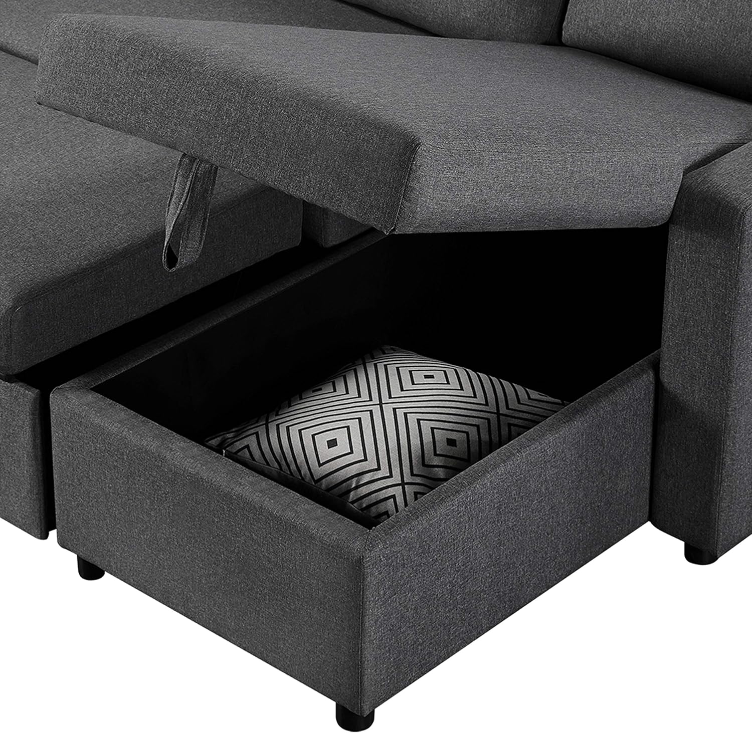 The chaise opens to reveal spacious out-of-sight storage for pillows, blankets, toys, etc.