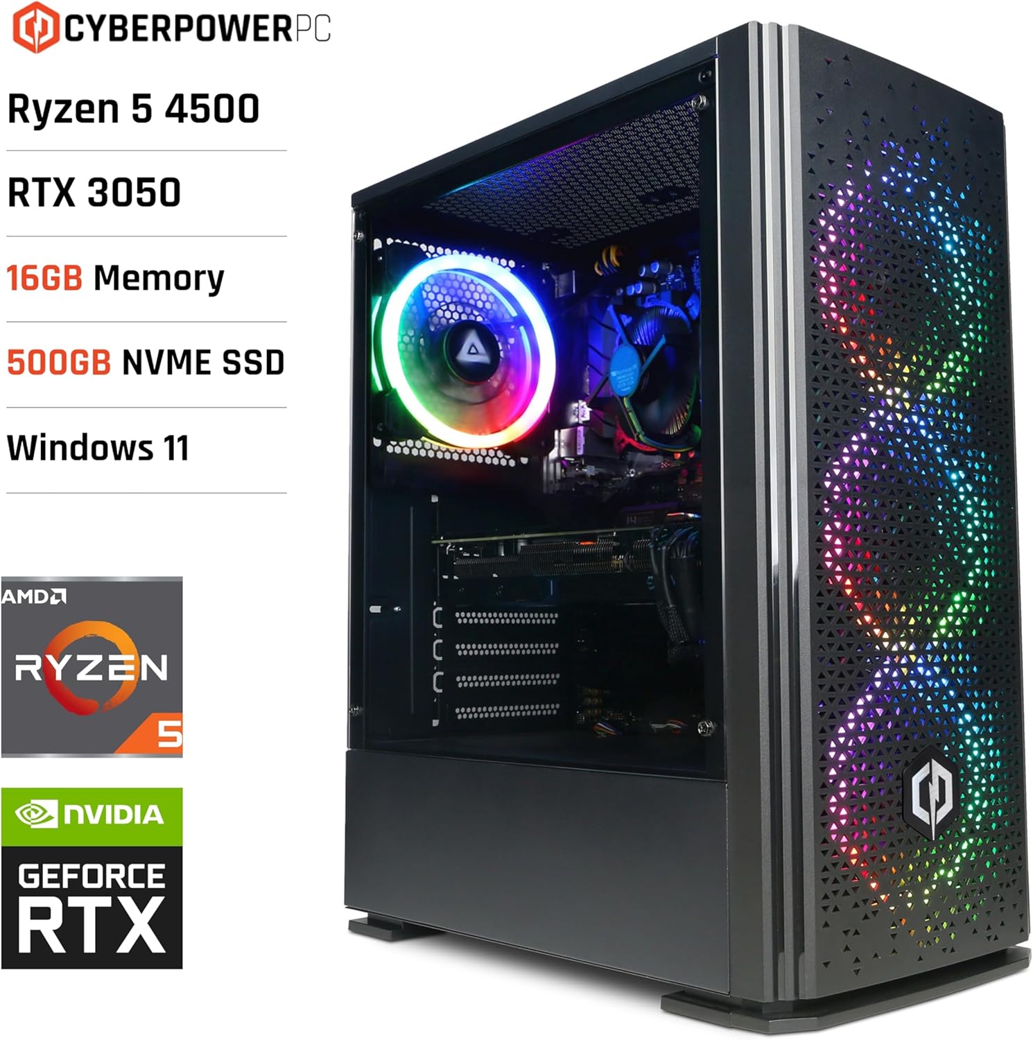 CyberpowerPC Wyvern Gaming PC – AMD Ryzen 5 4500, Nvidia RTX 3050, 16GB RAM, 500GB NVMe SSD, 650W 80+ PSU, WiFi, Windows 11, Blaze RGB