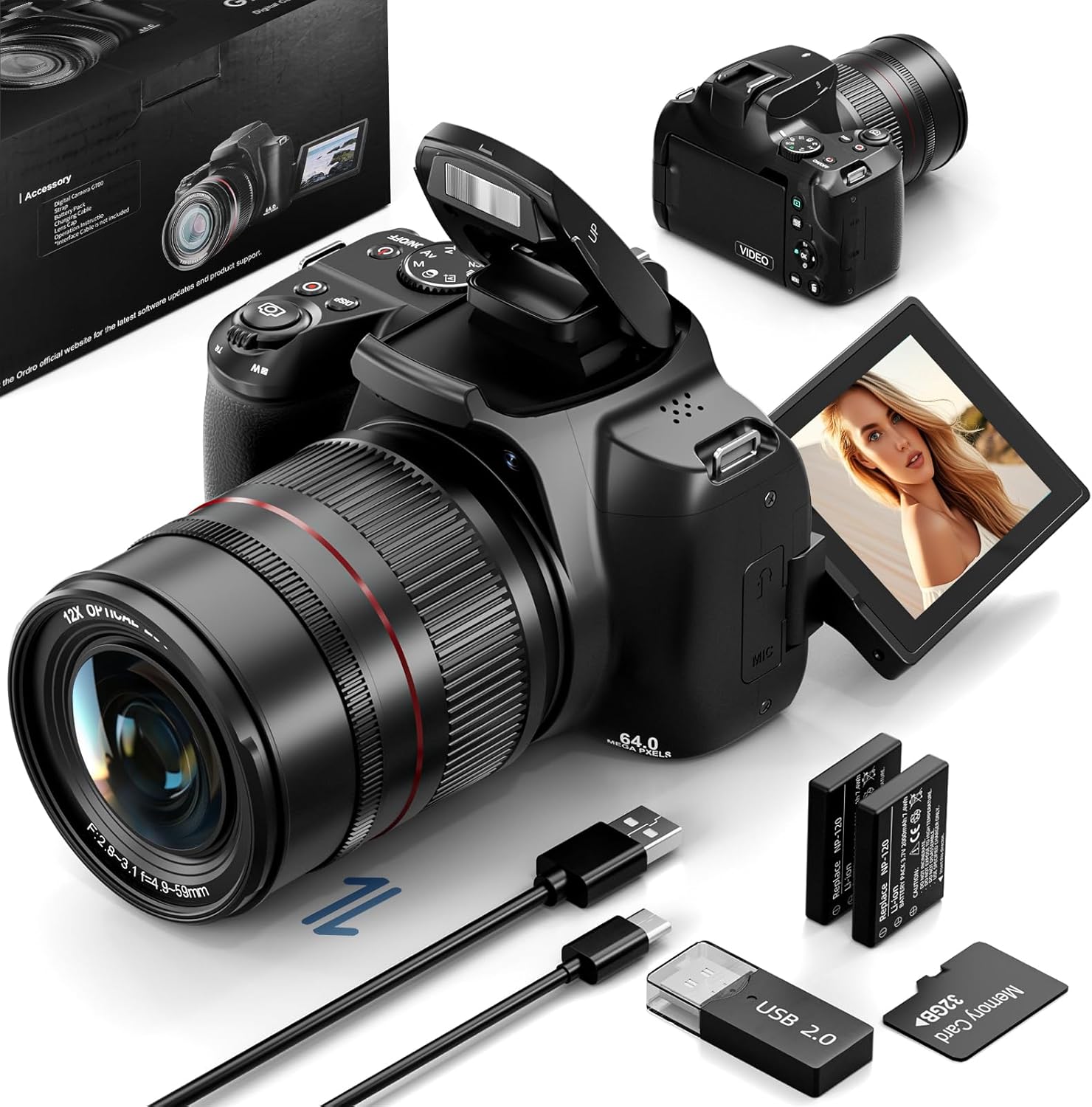 NBD 64MP Digital Camera for Photography, 4K DSLR Cameras for YouTube with 3”,270° Flip Screen,12X Optical Zoom & 30X Digital Zoom, 64G SD Card, WiFi& Autofocus with Flash, 2 Batteries (N700)