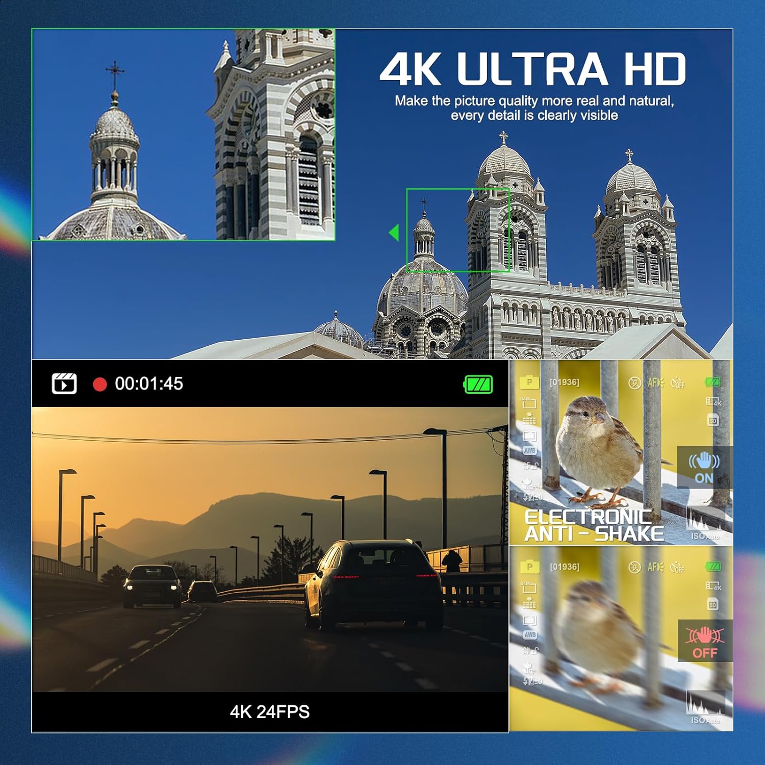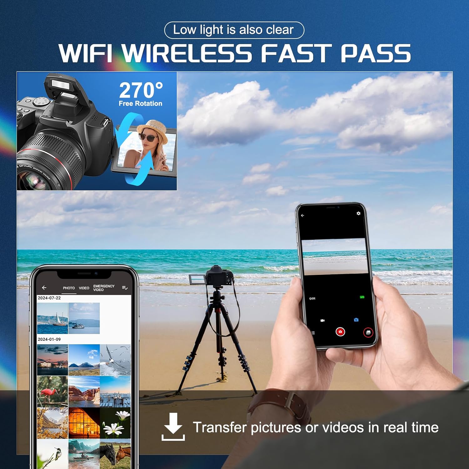 📷 【Digital Camera for Photography and Vide】: This digital camera features amazing 4K video capabilities and a high-resolution 64MP photo mode, allowing you to freeze the clearest real moments with a 4K field of view. The camera has a 3-inch screen that rotates 270 degrees in all directions, making blogging a breeze. The built-in electronic image stabilization function also allows you to take perfect photos of your family from any angle.