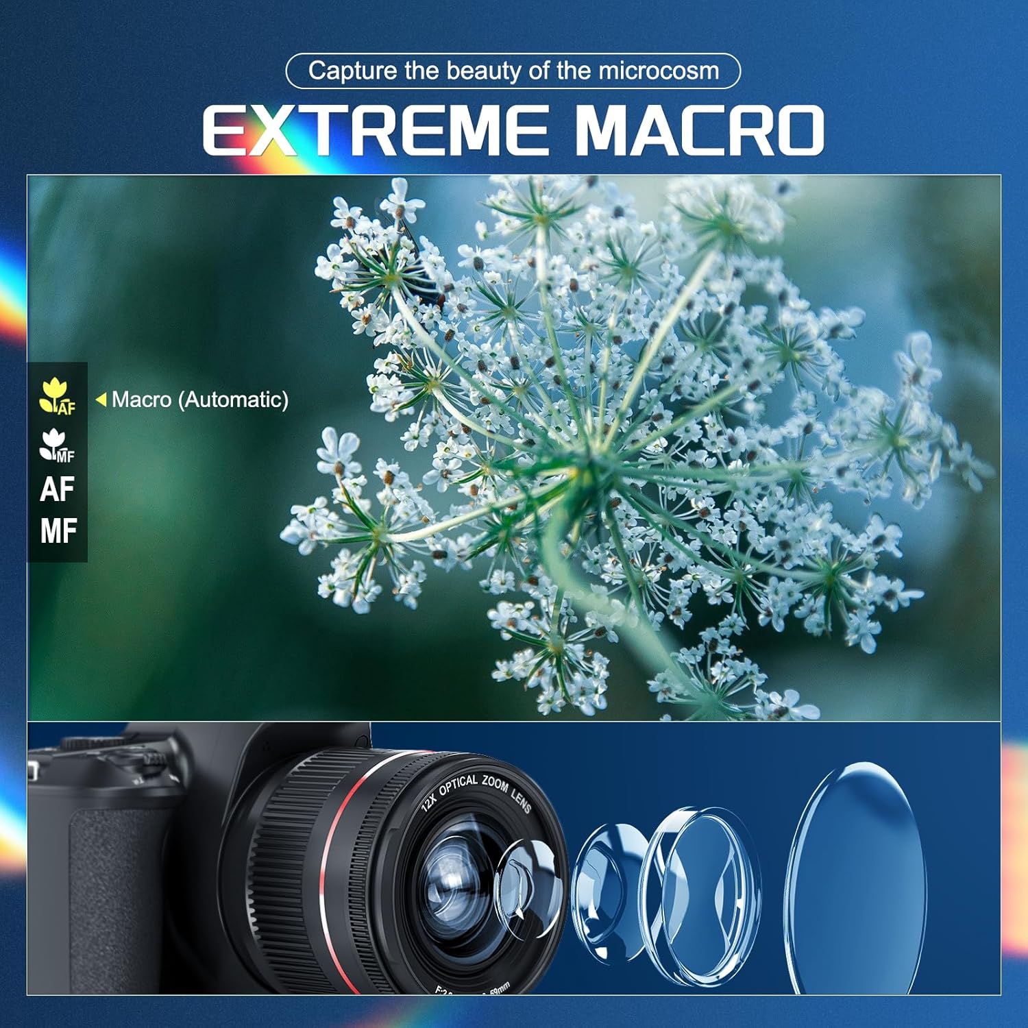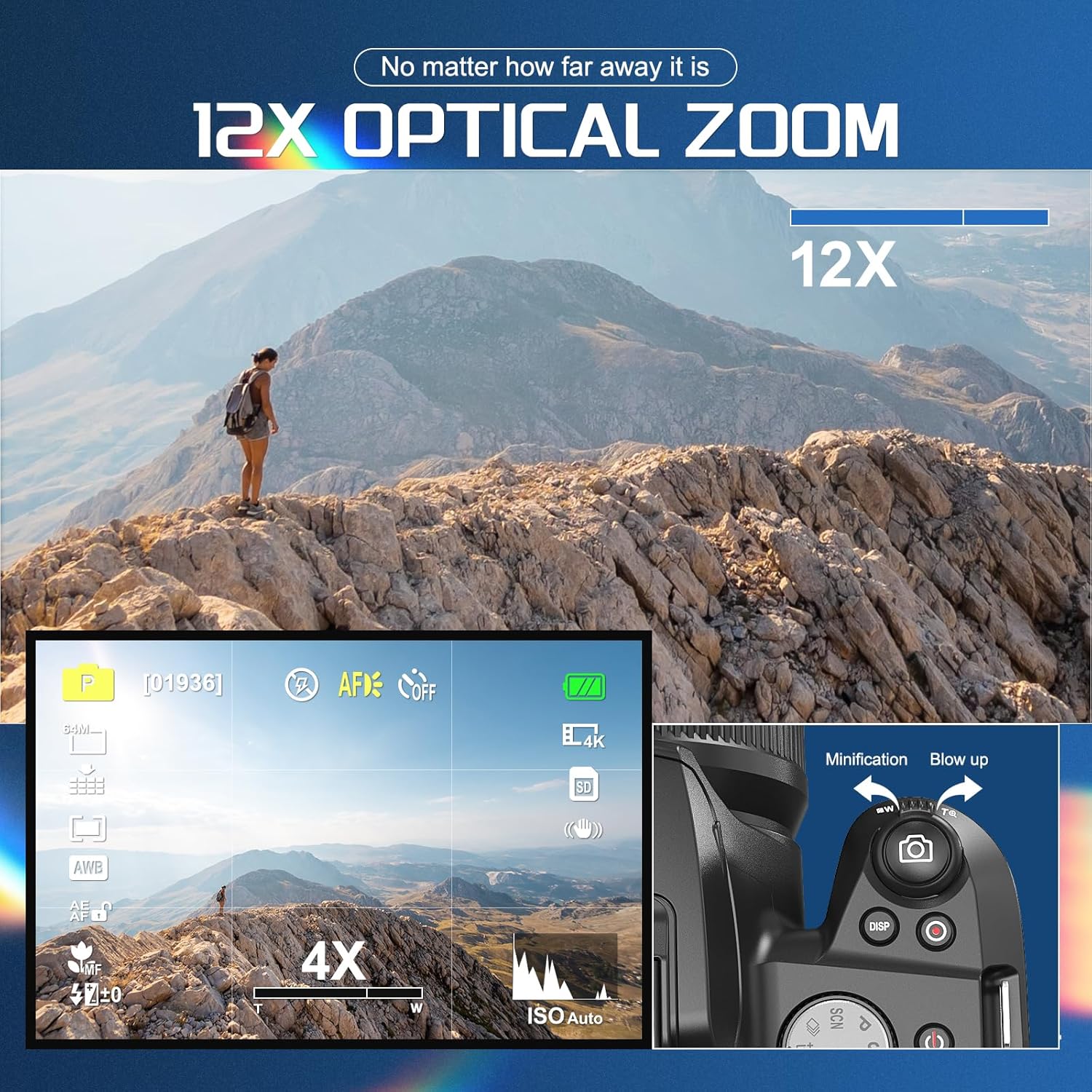 📷 【12x Optical Zoom SLR Camera】: This 4K camera is equipped with a professional optical zoom lens with a zoom of 12x, and a 4x optical zoom. With a maximum zoom of 30x, no matter how far away the picture is, it is right in front of you. It is perfect for capturing large scenes and close-up details. It also includes a wide-angle field of view, providing a wider perspective, and can also capture clear and detailed close-ups, such as flowers.