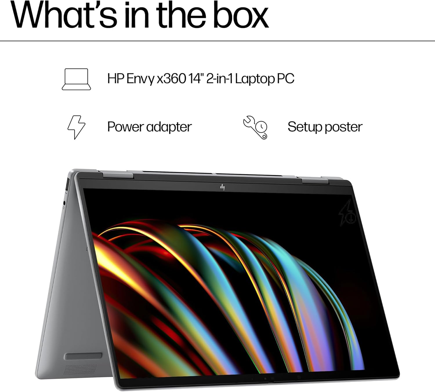 HP Envy x360 14″ 2in1 Laptop | Intel Core Ultra 7-155U | Intel Evo | AI Enhanced | 16 GB RAM | 512 GB SSD | Intel Arc | WUXGA IPS Touchscreen | Up to 19.5 hrs battery | Win 11 | Silver | 14-fc0003sa
