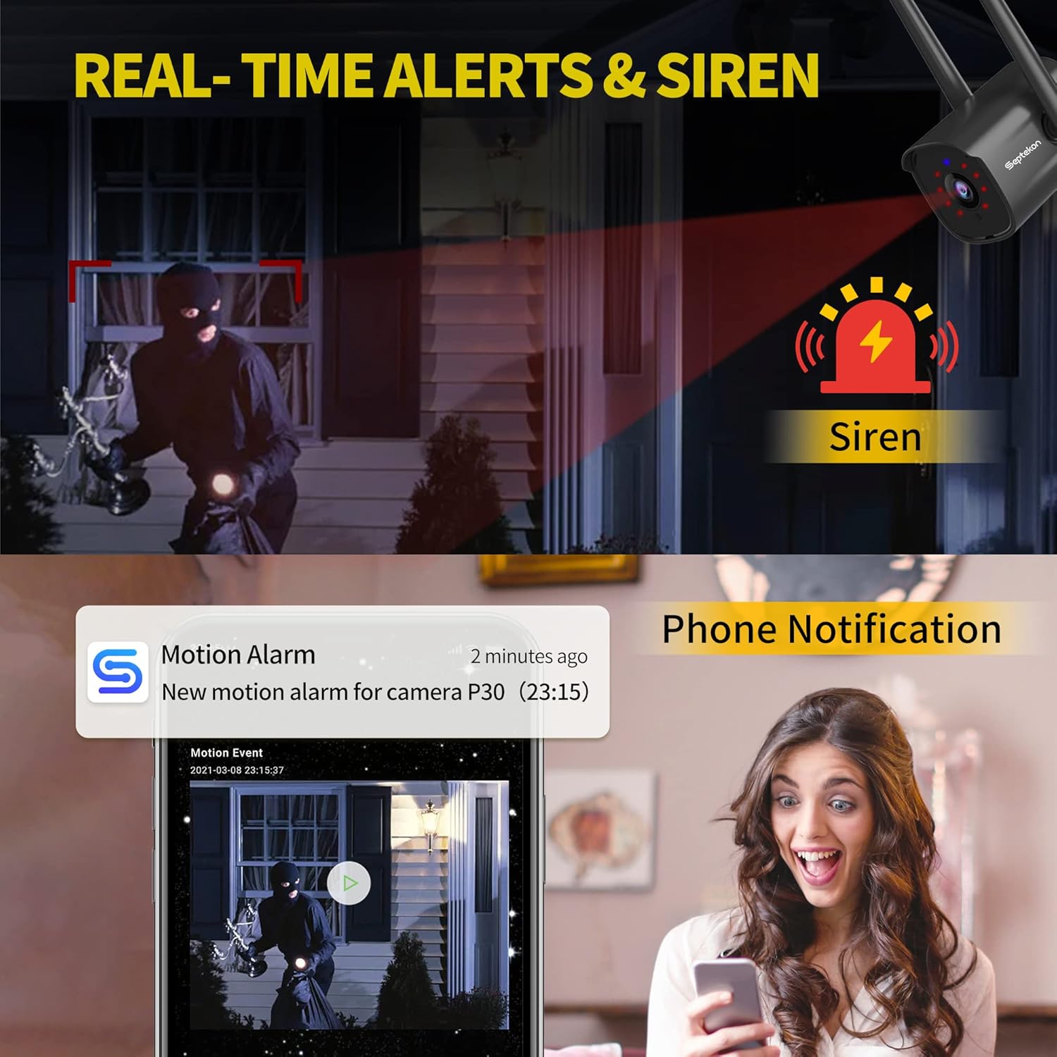 【Alarm Siren & Multi-user Access】You can set the camera’s automatic siren or sound the siren in case of emergency to scare away uninvited guests. Share the outdoor camera with your family (up to 8 users), protect your home together. Supports RTSP, Onvif and compatible with Alexa.