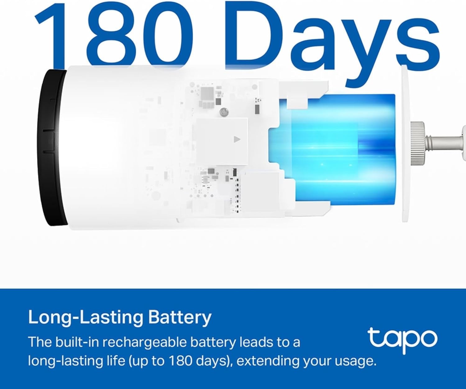 【Upgraded Rechargeable Battery】 The Tapo battery-powered security camera features an upgraded rechargeable battery that lasts up to 6 months on a full charge (based on Tapo laboratory tests with 250 uses per day)
