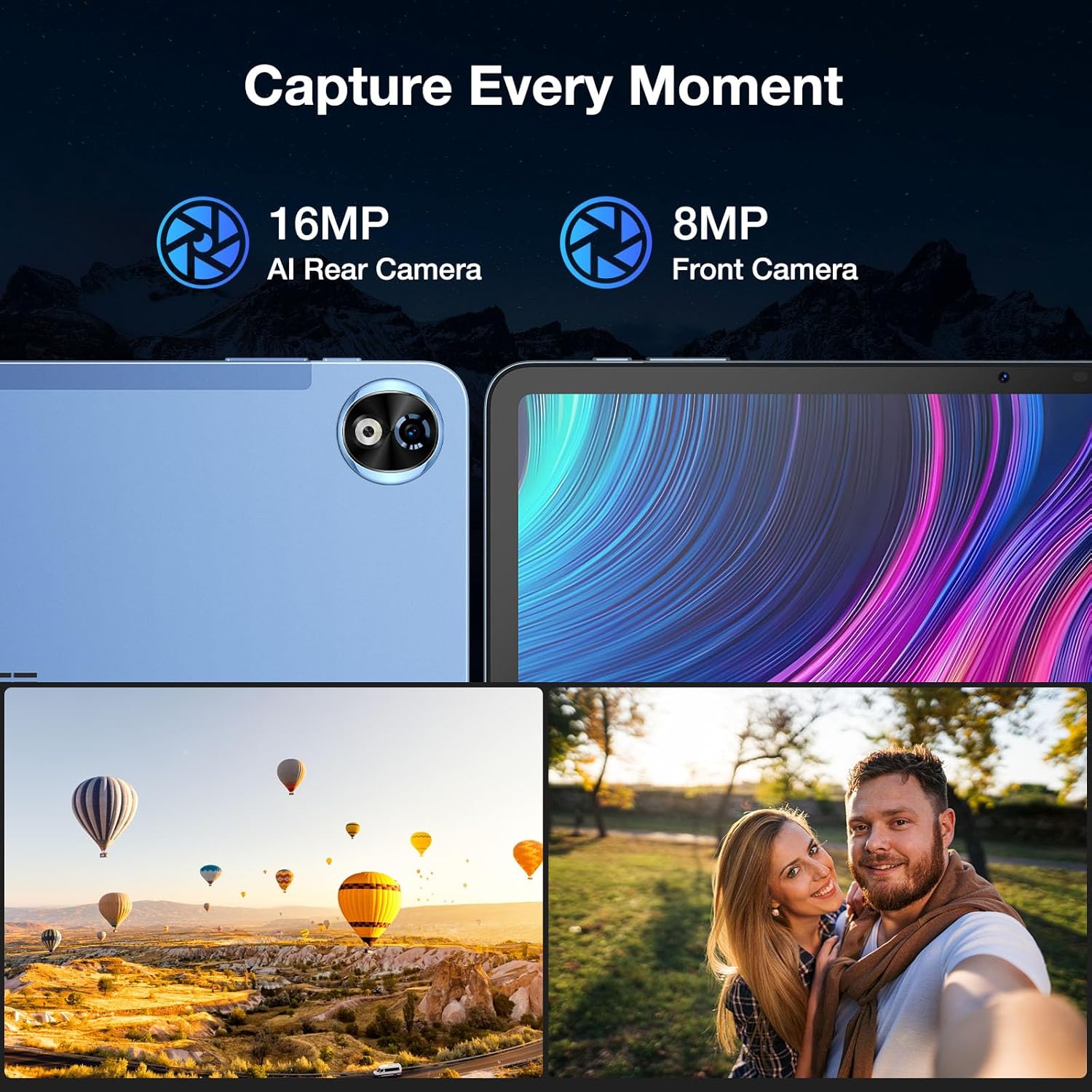 【4G LTE + 16MP Camera】The 12 inch tablet supports dual sim card and 2.4G/5GHz dual-band Wi-Fi for a fast online experience. The android tablet is a reliable companion whether you are working, studying or travelling. The 16MP rear camera allows you to capture unforgettable moments, the 8MP front camera supports high-quality video conferencing and face unlocking.